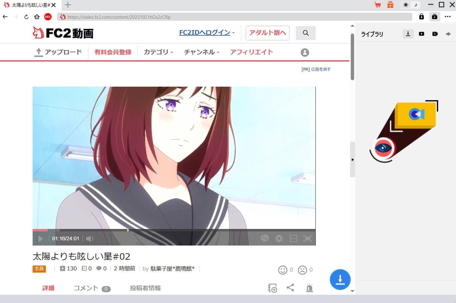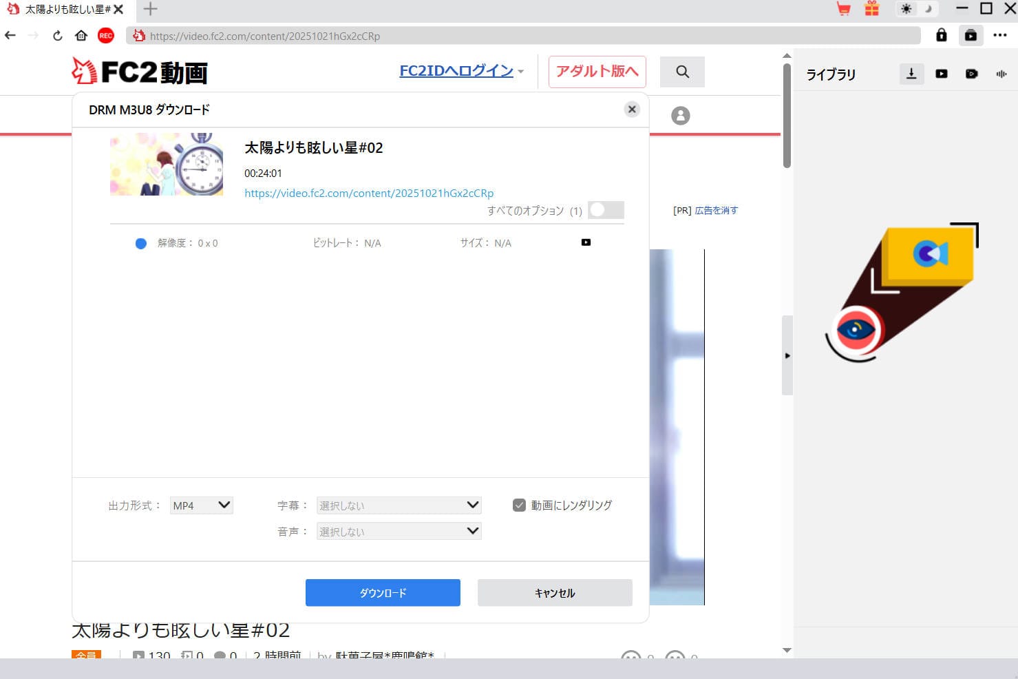 - 購入済みのFC2動画を再生すると、ソフトウェアが自動的に動画を検出し、右下角に「ダウンロード」ボタンが表示されます。このボタンをクリックすることで動画の解析が開始され、ダウンロード可能な品質オプションが表示されます。