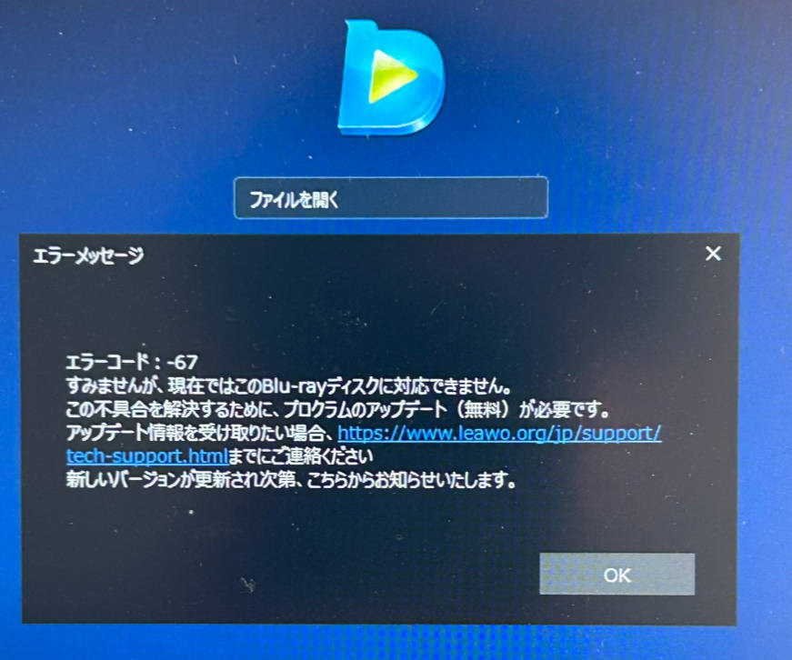- エラーコード:-67が表示される場合、問題のBDは新しいリリースであり、V82 AACSプロテクターで保護されているため、Leawo側からの対応を待つ必要があります。ソフトウェアを最新バージョンに更新して数日間待ってからもう一度再生を試してください。