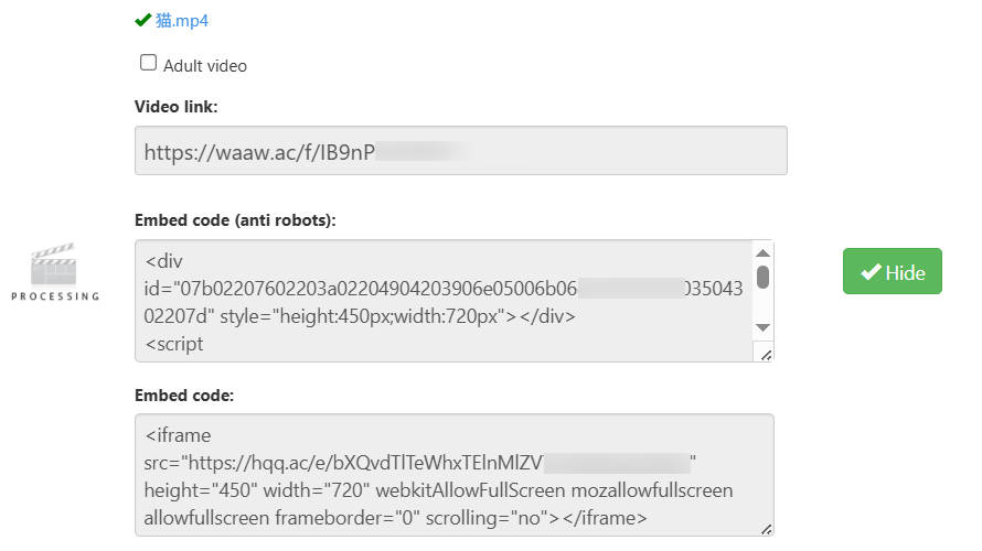 2. アップロード開始後、進捗を確認し、完了を待ちます。完了すると、共有リンクや埋め込みコードが生成されます。