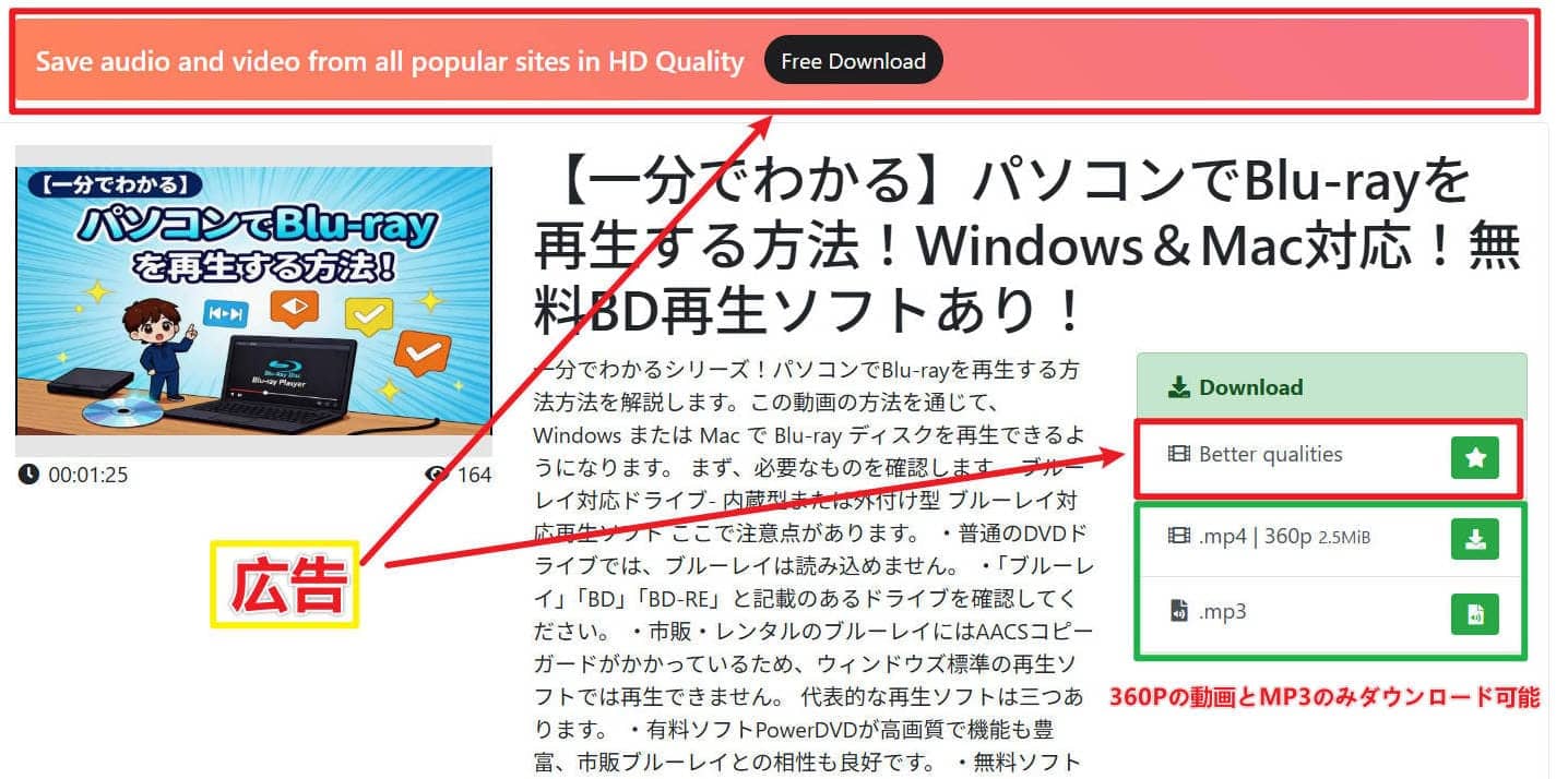 TubeNinjaでは複数の解像度を選択できるように見えますが、実際にダウンロードできる最高画質は制限されており、360Pの動画とMP3音源しか安定してダウンロードできません。フルHD(1080p)を超える高解像度やオリジナル画質の動画は、クリックすると「4kdownload」という別のソフトの広告ページにジャンプします。