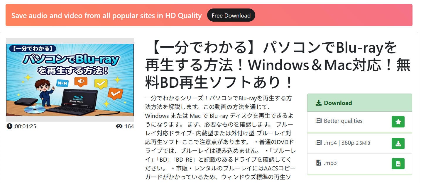 - 処理が完了すると、利用可能な画質や形式の選択肢が表示されるので、希望のものを選んでダウンロードを実行します。