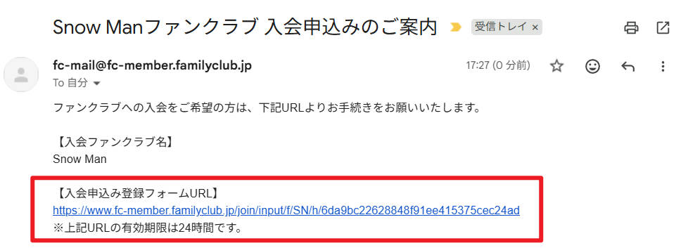 3. 「ファンクラブ入会申込みメール」が送信されます。受信を確認します。「ジュニア情報局入会申込みメール」に記載されたURLをクリックします。