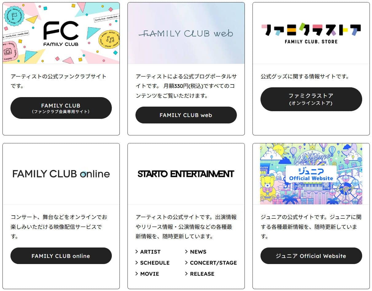 現在は株式会社FAMILY CLUBが独立して運営しています。公式X(Twitter)アカウントは@fconline_fcoです。FC関連のサイトは複数ありますが、すべて STARTO ENTERTAINMENT(旧ジャニーズ系)ファン向けの公式サービスで、目的・内容・料金が完全に別物です。以下はそれぞれの紹介です。