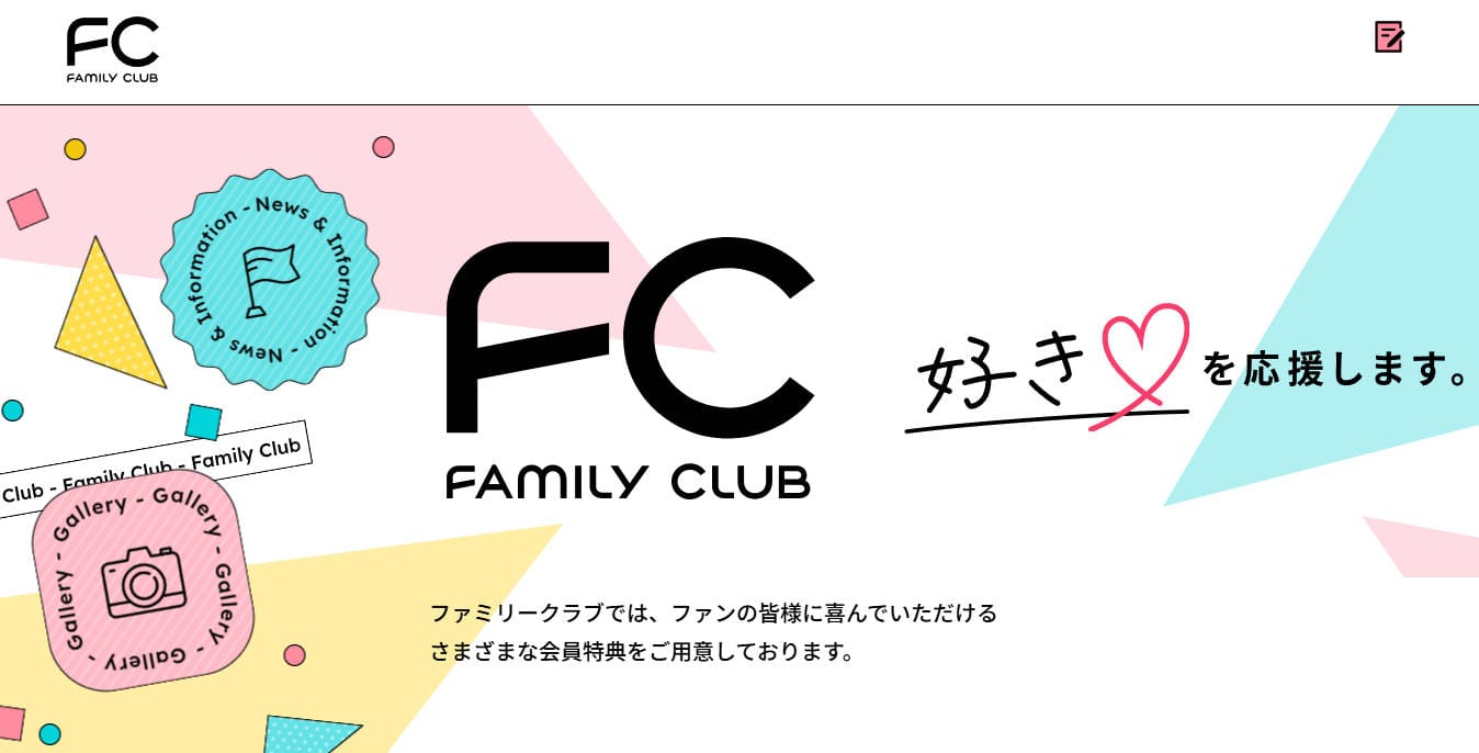 • FAMILY CLUBは、STARTO ENTERTAINMENT(旧ジャニーズ事務所)所属のアーティストのファンクラブ(FC)は、ファン向けの有料会員制サービスです。
